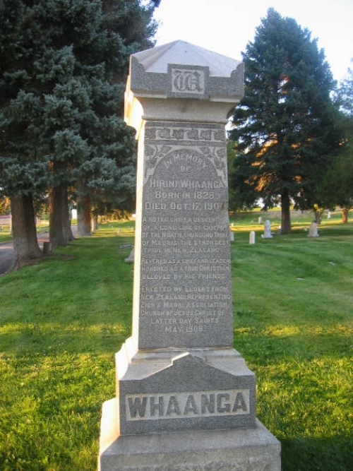 In May 1908 a monument to Hirini Whaanga was erected in the Salt Lake City cemetery. The stone marked the end of a long trip for Hirini Whaanga. He was born on the eastern coast of New Zealand in 1828 where he eventually succeeded his father as chief of the Ngatikahungunu Tribe of Maoris, the strongest tribe of the island according to his monument. When Mormon missionaries arrived in New Zealand in 1882 Chief Whaanga welcomed them with gifts and hospitality, winning the respect of his proselytizing guests. And the missionaries apparently made an impression on Chief Whaanga and his people. There were 144 baptisms recorded in one year of missionary John Clarence Stewart's diary, and 220 mentioned in a letter to his mother. Stewart baptized Chief Whaanga at Nuhaka on November 30, 1884. [See Footnote i.]
