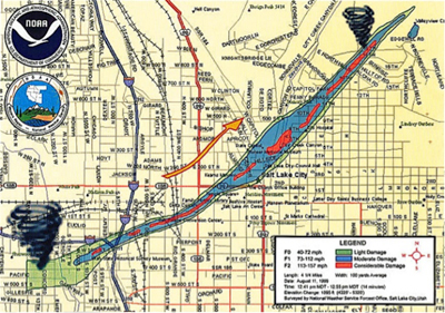 The wind flowing west out of the mountain canyons is instrumental in cooling the hot Salt Lake summer nights. On August 7, 1999, however, the wind turned deadly when a rare tornado, following no grid, carved a diagonal path through the center of the city. Around 1pm, the F2 tornado crossed over the Delta Center (now Energy Solutions Arena) picking up pieces of roof and insulation, before destroying a block long tent constructed for the Outdoor Retailers convention and blasting out all the windows of a high-rise hotel. Cranes used in constructing the LDS conference center toppled just missing the Mormon Temple. Moving toward the State Capitol, the tornado tore up most of the trees on the Capitol grounds and in Memory grove, before crossing east to the historic avenues, where it destroyed 34 homes and severely damaged over 120 before terminating near the base of the Wasatch Mountains. This major tornado was the first ever to hit the downtown district of a major city and strike buildings upwards of 500 feet in height.