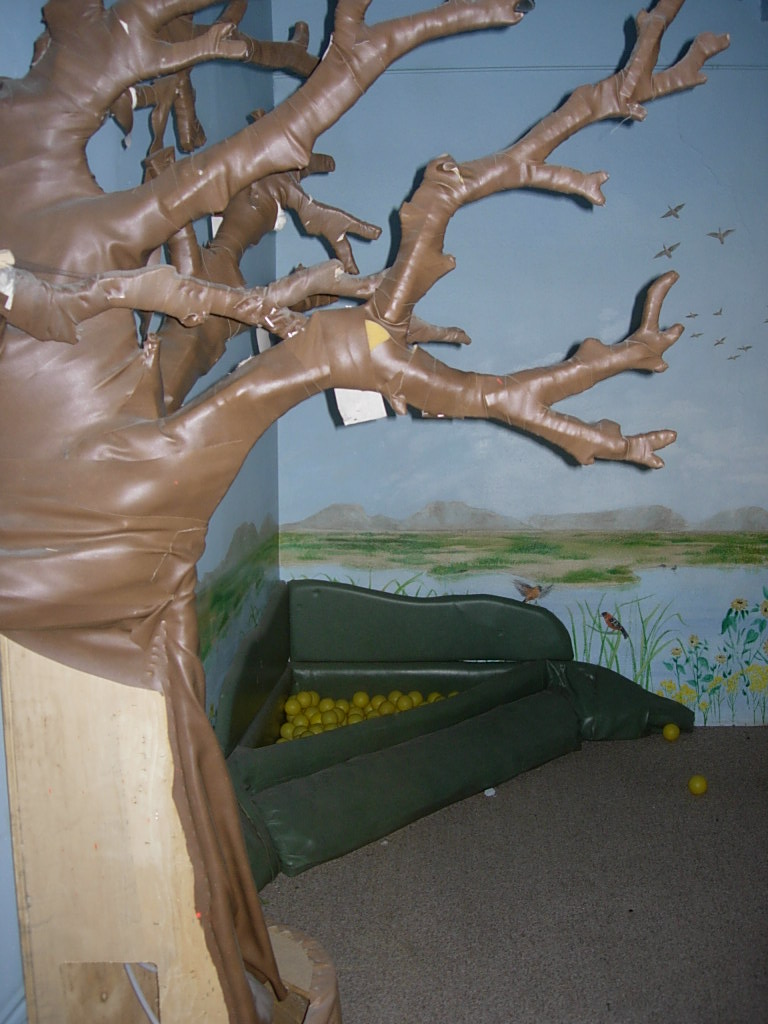 Likewise, nearly all of the murals on the walls remain – jungle scenes, marshlands, cowboys, Alice in Wonderland tropes, red rock desert views, even the “Studio of 10,000 Hands,” which features a room wallpapered in children’s handprints. Remarkably, none of these scenes have been defaced with graffiti or otherwise damaged. In a building less than a block from a rail yard – the epicenter of tagging in most cities – this seems almost unfathomable. It is as if those who did break in or stay here appreciated these touches to an otherwise dreary situation. The contrast of cheerfulness and inquisitiveness within the confines of a dim and slowly decomposing building is unsettling and in many of the rooms we find there is little to say. We are deep in the uncanny by the time we walk through two rooms upstairs that feature various playground equipment, including a tree house, a slide made to look like a cave, a ball pit complete with balls, and a sandbox still full of sand. With the exception of the sandbox, which is full of dead roaches (the only insects I see anywhere in the building) and raccoon prints, all these are clean and nearly pristine as if abandoned in the middle of a workday. However, people have clearly slept and eaten and lived only a few feet away and I can’t help but quietly obsess on that small detail as we continue on. Those rooms didn’t provide any obvious comforts or convenient access to exits or hiding places. So, did these things provide some small measure of safety or nostalgia? Did they create in squatters the same childish urge I have to play in the sand or climb in the tree house? Did they have children with them? That last question is perhaps more heartbreaking than anything else in the site.